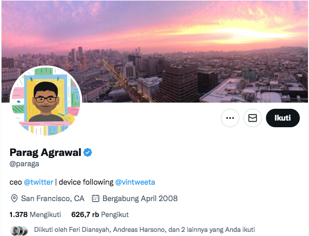 Namun, meski sudah dipecat sebagai CEO Twitter, Elon Musk masih mengikuti Parag Agrawal di media sosial berlogo si burung biru, itu. Bahkan, saat berita ini ditulis, Parag Agrawal, masih menulis di bio akun Twitter miliknya @paraga sebagai “ceo Twitter”.